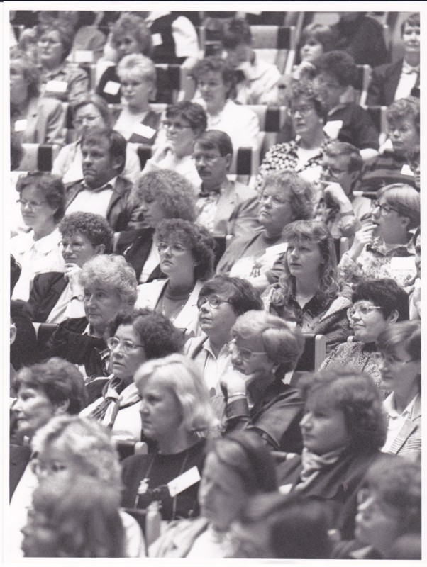 Ryhmäkuva vuosikokoukseen osallistujista auditoriossa Kajaanin kirjastopäivillä 1991.