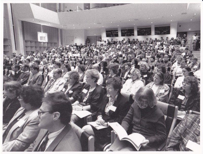 Auditorioon kokoontuneet vuosikokoukseen osallistujat Kajaanin kirjastopäivillä 1991.